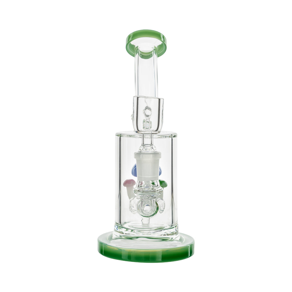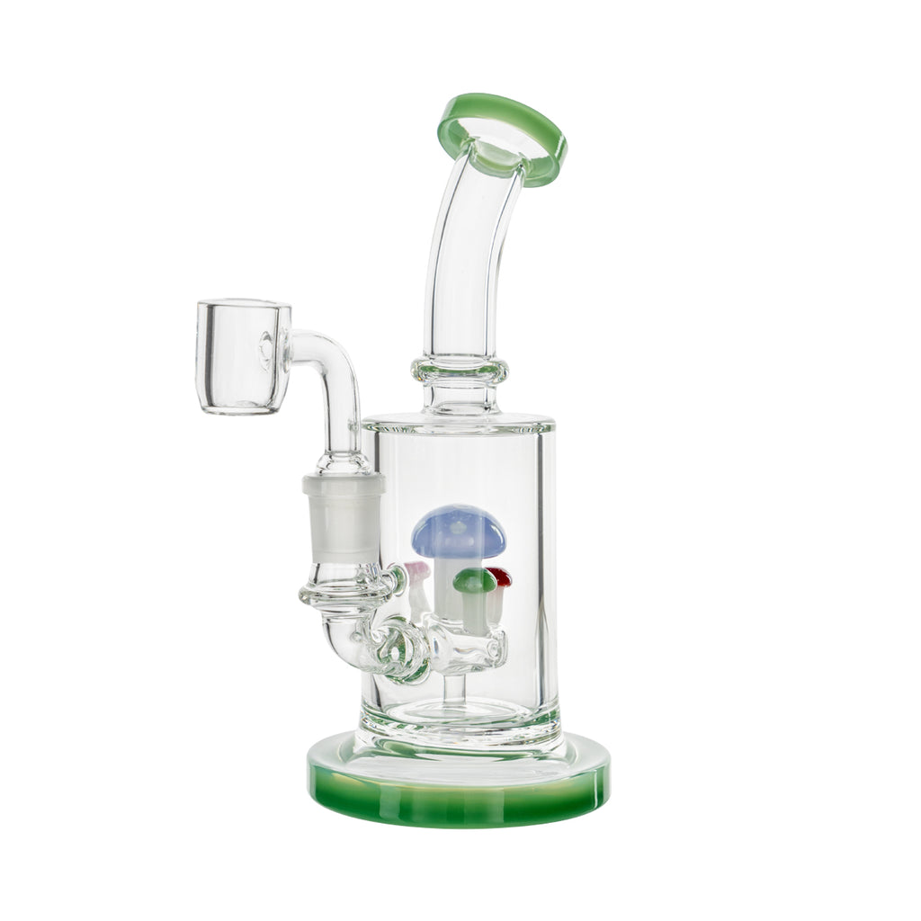 Finished with soft jade green accents and vibrant milk blue mushroom details, this dab rig adds a pop of color without feeling over-the-top. It’s a great mix of clean glass, fun design, and everyday functionality.