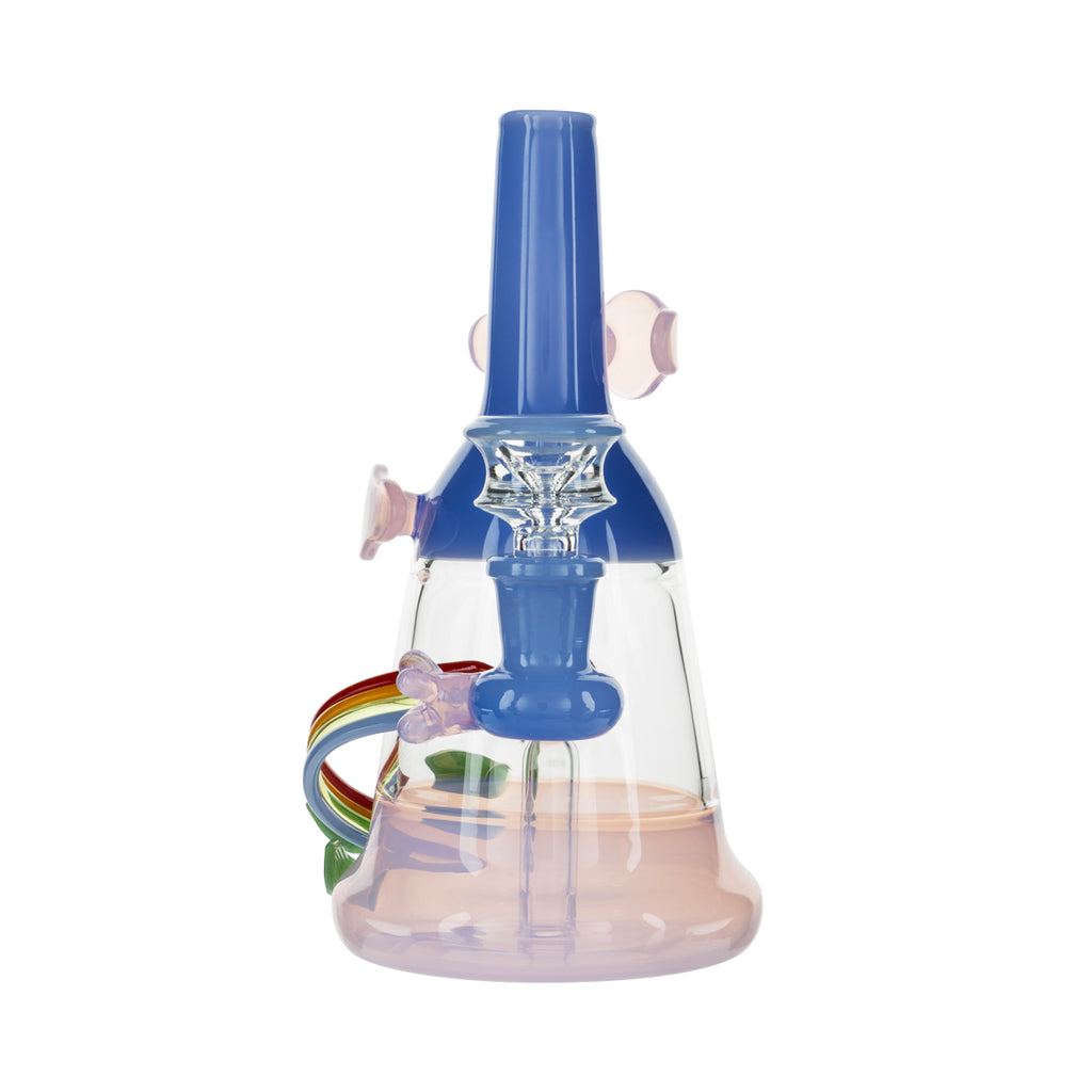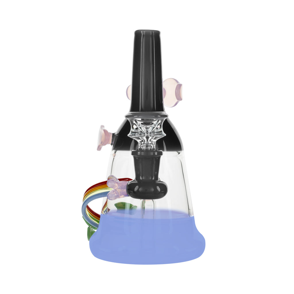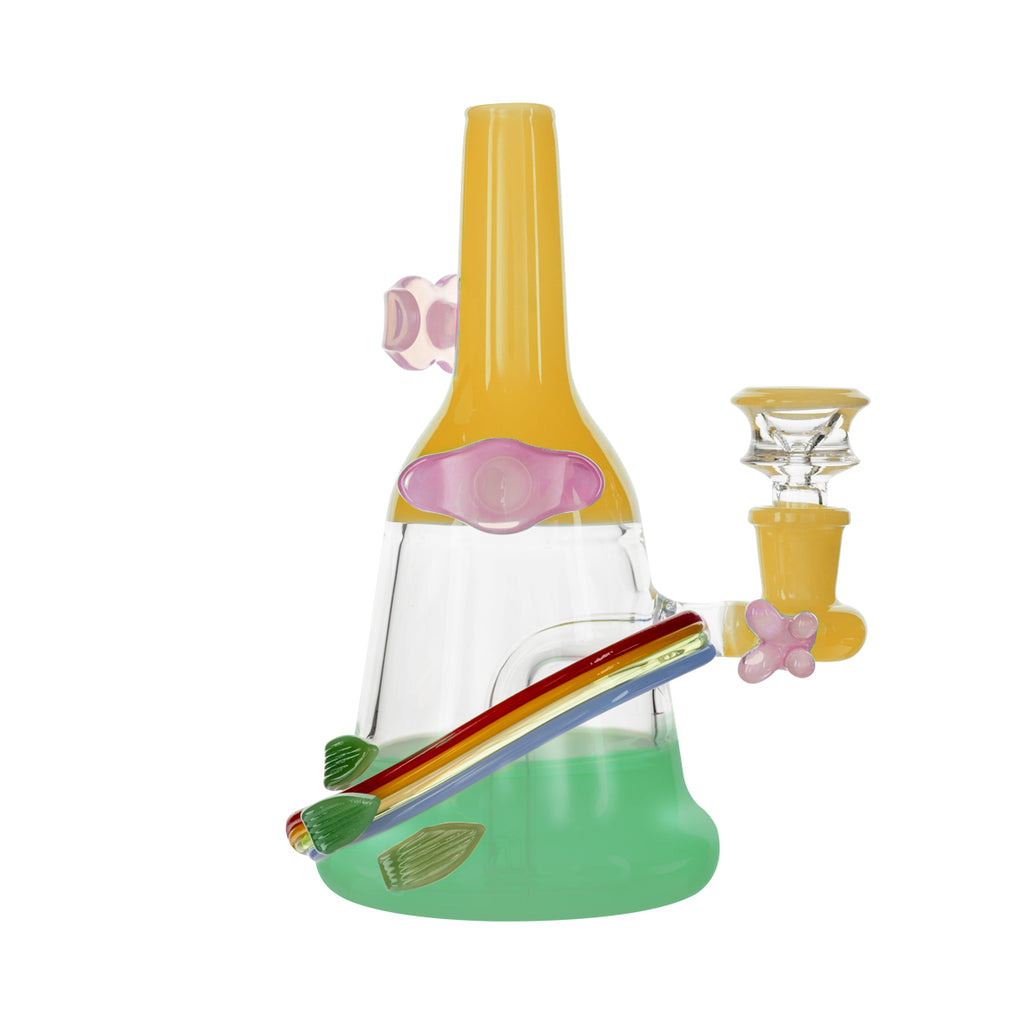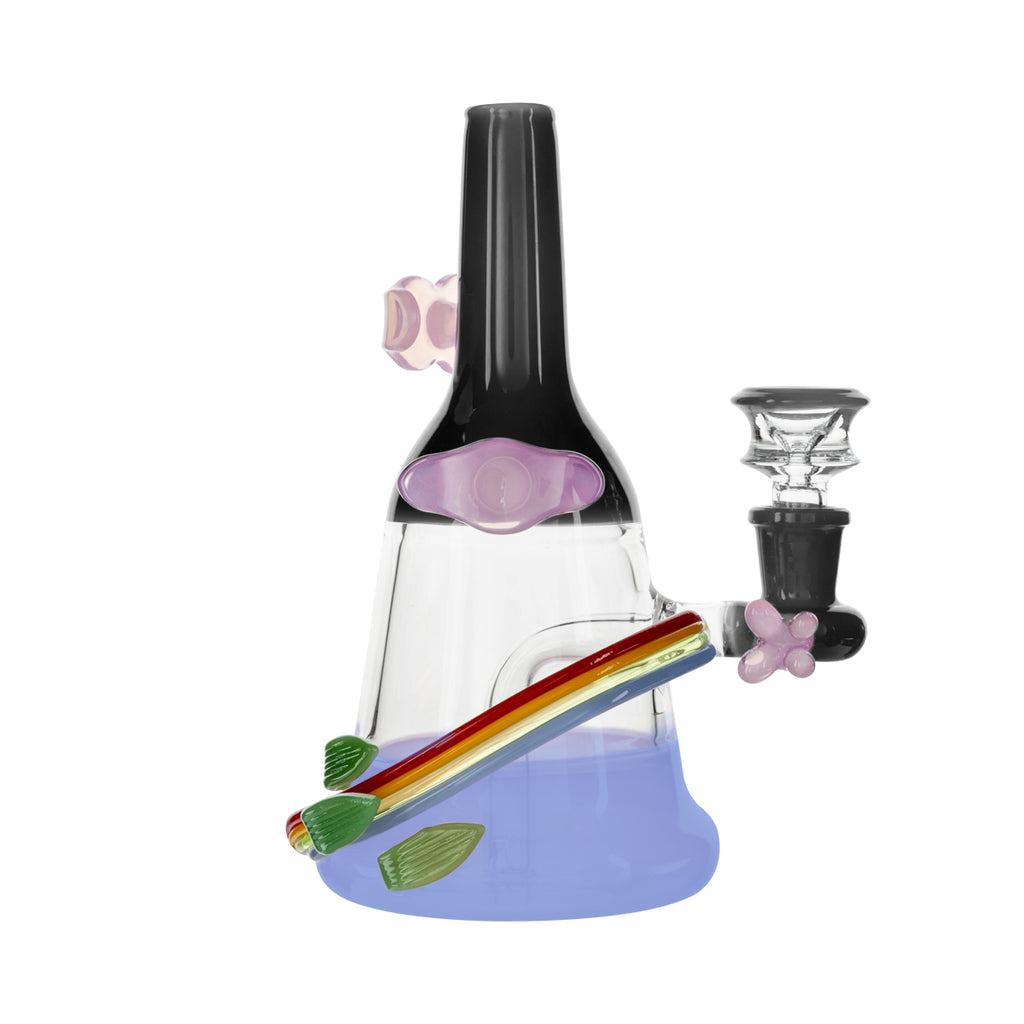 The compact 7" glass water pipe features a classic beaker base that adds stability and delivers clean, filtered pulls every time. What really makes this piece pop is the hand-applied glass artwork throughout the beaker. A vibrant rainbow glass accent wraps across the body, paired with sculpted leaf details and decorative glass attachments that give this decorated bong a fun, custom feel you won’t find on basic clear glass.