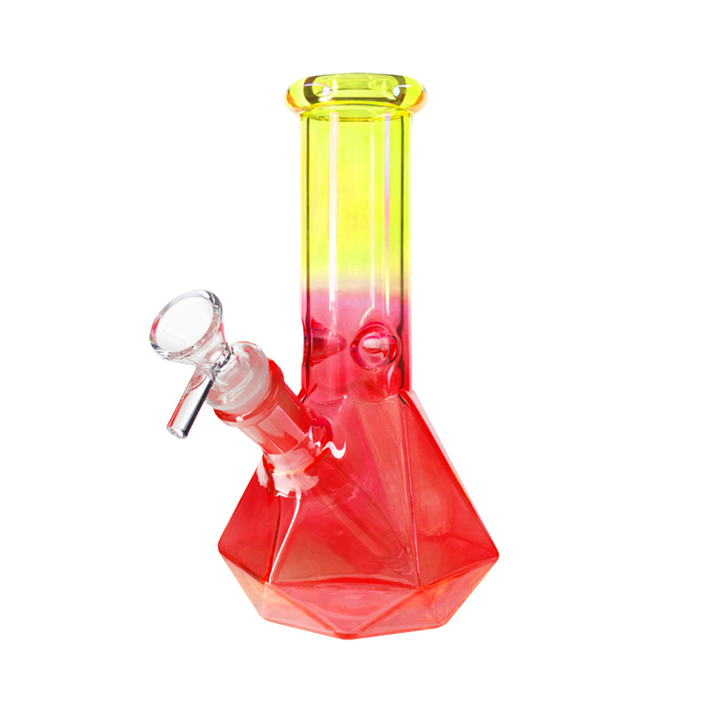 Bring a splash of color to your sesh with the 7" 4mm Hexagon Base Beaker Bong, a stunning 7-inch glass water pipe designed to elevate both your style and your smoking experience. With a vibrant dual-tone ombré finish that shifts like a sunset and a sleek diamond-cut base, this piece looks just as good on your shelf as it does in your hand.